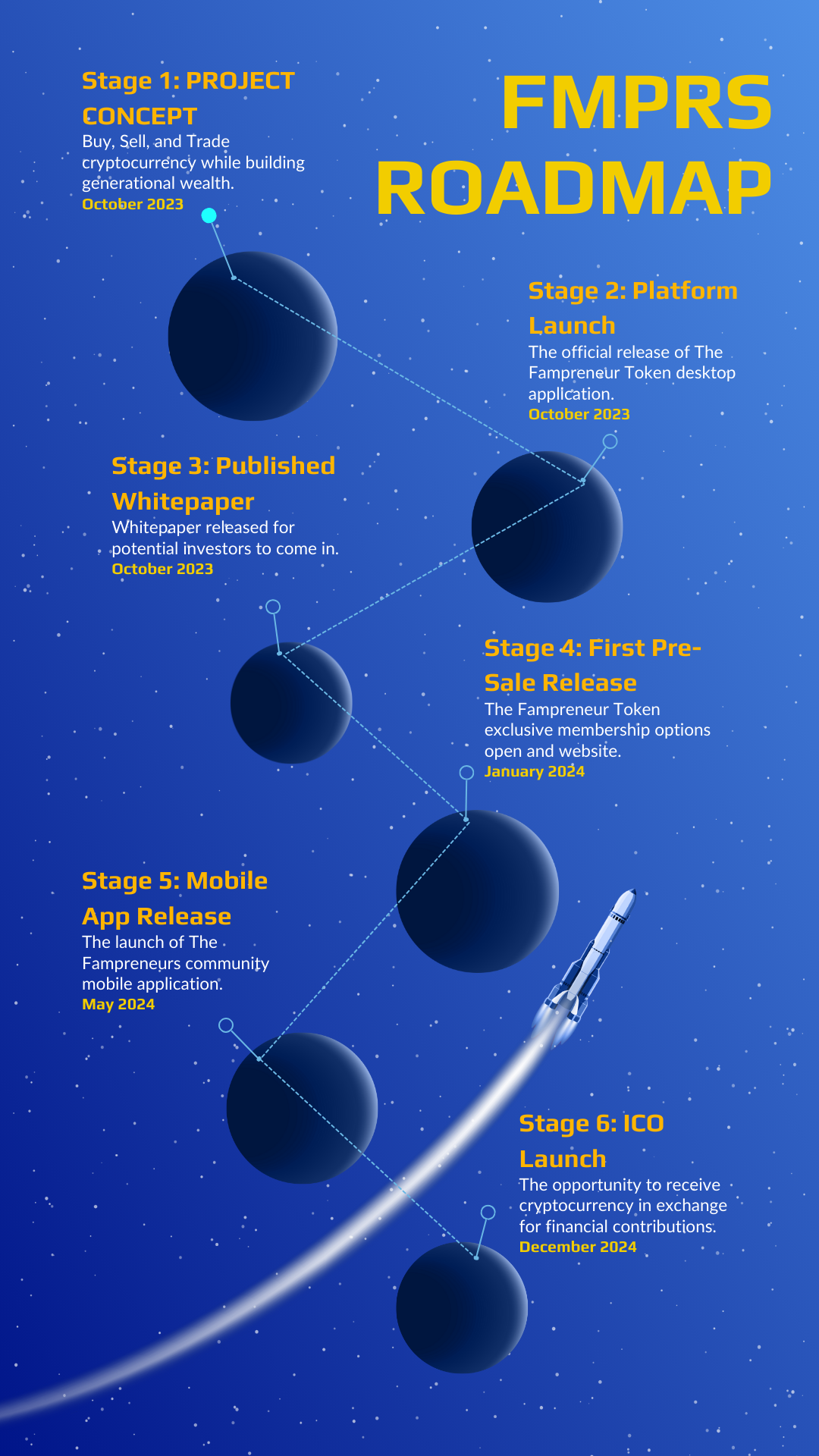 The FMPRS roadmap, kicking off in October 2023, charts the journey of the Fampreneurs community, starting with the project's core concept and leading up to the ICO launch in December 2024. Key milestones include the platform's official release, whitepaper publication, exclusive pre-sale, and the debut of the mobile application.